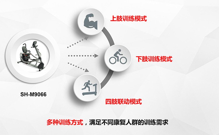 星空xk健身器材-四肢联动器械 可通过上肢带动下肢,健侧带动患侧,一肢带动三肢、上肢伸够、下肢蹬踏的基础的功能性四肢联动训练方式解决零肌力患者早期的主动康复训练;满足患者全身功能性、协调性的运动训练需求;提供了早期的有氧训练,并自带心率监控装置,通过设定靶心率保证训练安全和效果;安全的主动运动,保证患者训练安全,并可加快本体感觉的恢复。