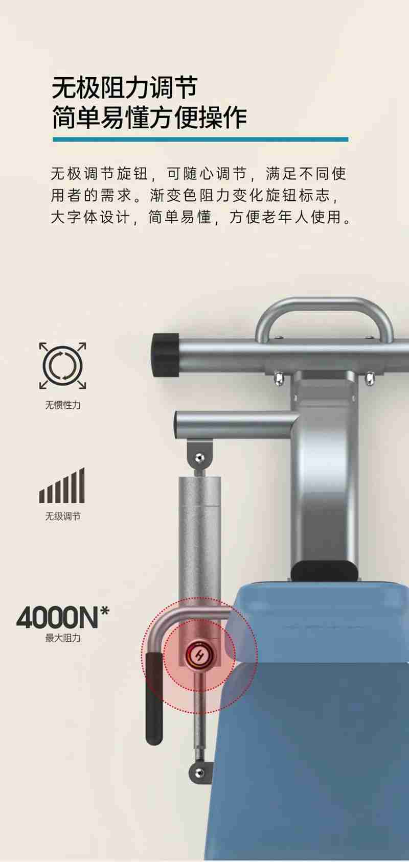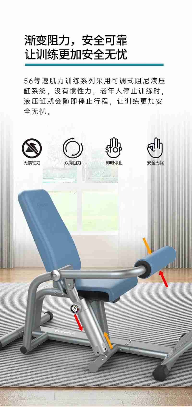 56系列老年液压力量训练器,采用液压缸阻抗设计,产生的阻力大小仅随使用者力量的输出而改变,有效降低超负荷损伤发生的机率。遵循老年人主要肌群的自然运动,符合老年人运动轨迹,使其进行肌肉力量练习的同时可有效保护关节。双向阻力无极微调,从小到大阻力区间,可以精细调节不同使用者的阻抗力,锻炼更加科学有效,专门针对老年人薄弱力量设计,安全性高,强度低,调节方便。
