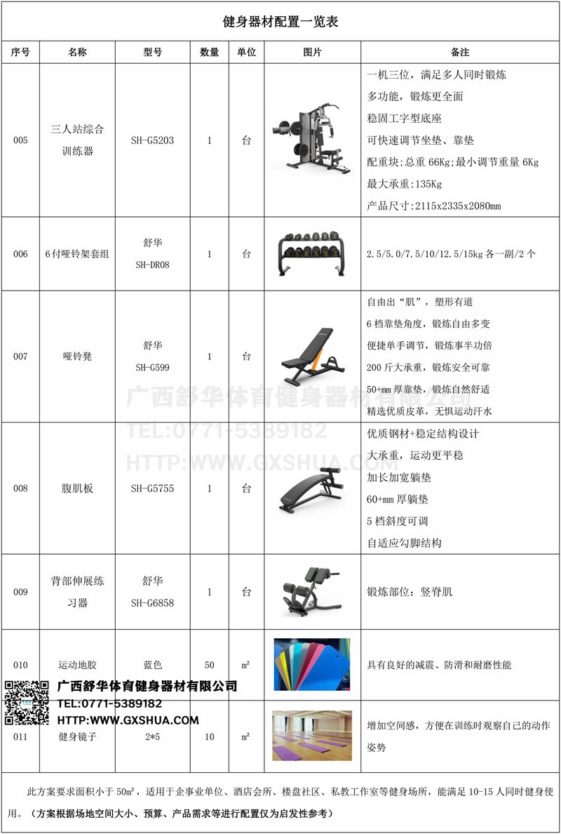 此方案要求面积小于50m²,适用于企事业单位、酒店会所、楼盘社区、私教工作室等健身场所,能满足10-15人同时健身使用。(方案根据场地空间大小、预算、产品需求等进行配置仅为启发性参考)