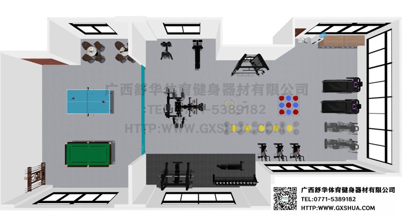 休闲区域配置台球桌、乒乓球桌,具有更强的娱乐性和趣味性,能够吸引更多员工参与到健身活动中来,提高健身房的使用率,让员工在工作之余有更多放松身心的方式。